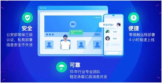 三、安全、可信是融云的重要标签。融云可将通信能力进行私有化部署,通过“内外网文件隔离、背景水印、阅后即焚、远程数据擦除”等功能,保证政府线上办公的通信安全。