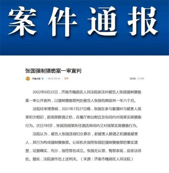 中新网6月22日电 据山东省济南市中级人民法院官方微博消息,2022年6月22日,济南市槐荫区人民法院依法对被告人张国强制猥亵案一审公开宣判,以强制猥亵罪判处被告人张国有期徒刑一年六个月。
