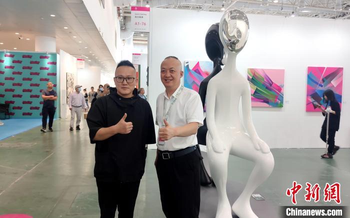 艺术厦门博览会组委会主任罗文轩(右)与艺术家苏武在《wake up 觉》作品前合影。 中新网记者 杨伏山 摄