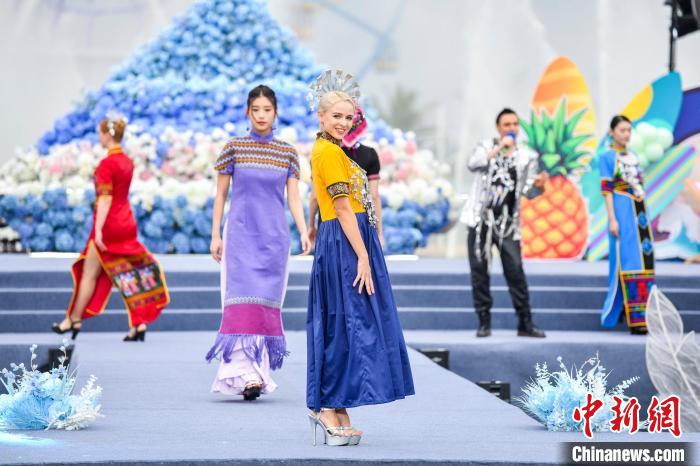 12月27日,《海的传说》新年诗歌音乐会在海南陵水举办,图为外国模特穿着海南黎锦服饰走秀。中新网记者 骆云飞 摄