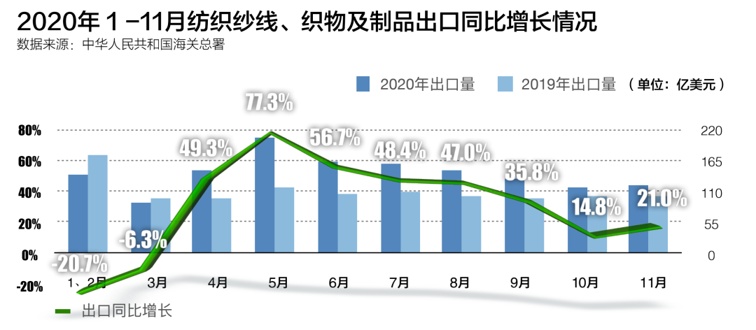 其实在2020年11月之前中国纺织品出口的表现便不错,4月出口同比增速便已转正,5月单月出口量超过200亿美元,同比增长高达77.3%。