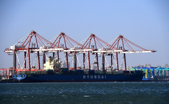 1月11日,一艘货轮停靠在天津港欧亚国际集装箱码头。