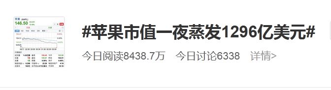 12日,#苹果市值一夜蒸发1296亿美元#话题登上微博热搜榜第一,截至发稿话题阅读量超8000万。