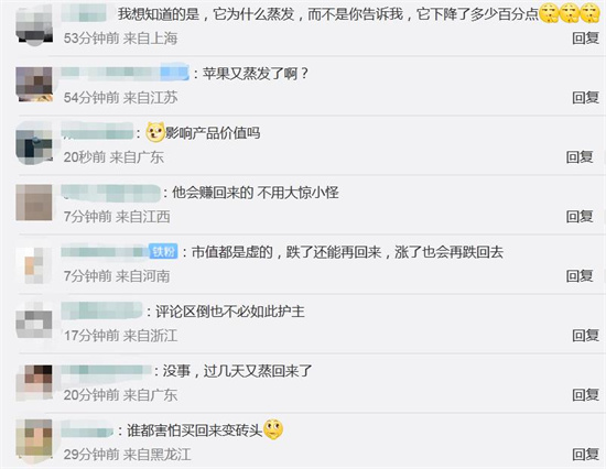 有网友称,“整个美国的股市都在下跌,苹果股市下跌意料之中啊”,还有网友调侃:“与其让它蒸发,给我个零头也行啊”。