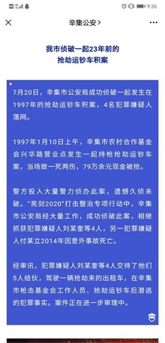 据微信公号“辛集发布”7月23日通报,7月20日,辛集警方侦破这起发生在1997年的抢劫运钞车积案,4名嫌疑人落网。