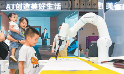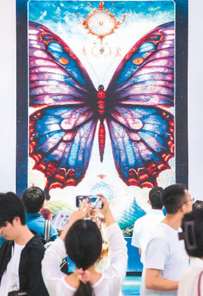 在上海市举办的世界人工智能大会上,观众在AI绘画展示区驻足观赏。 胥昆德摄(人民视觉)