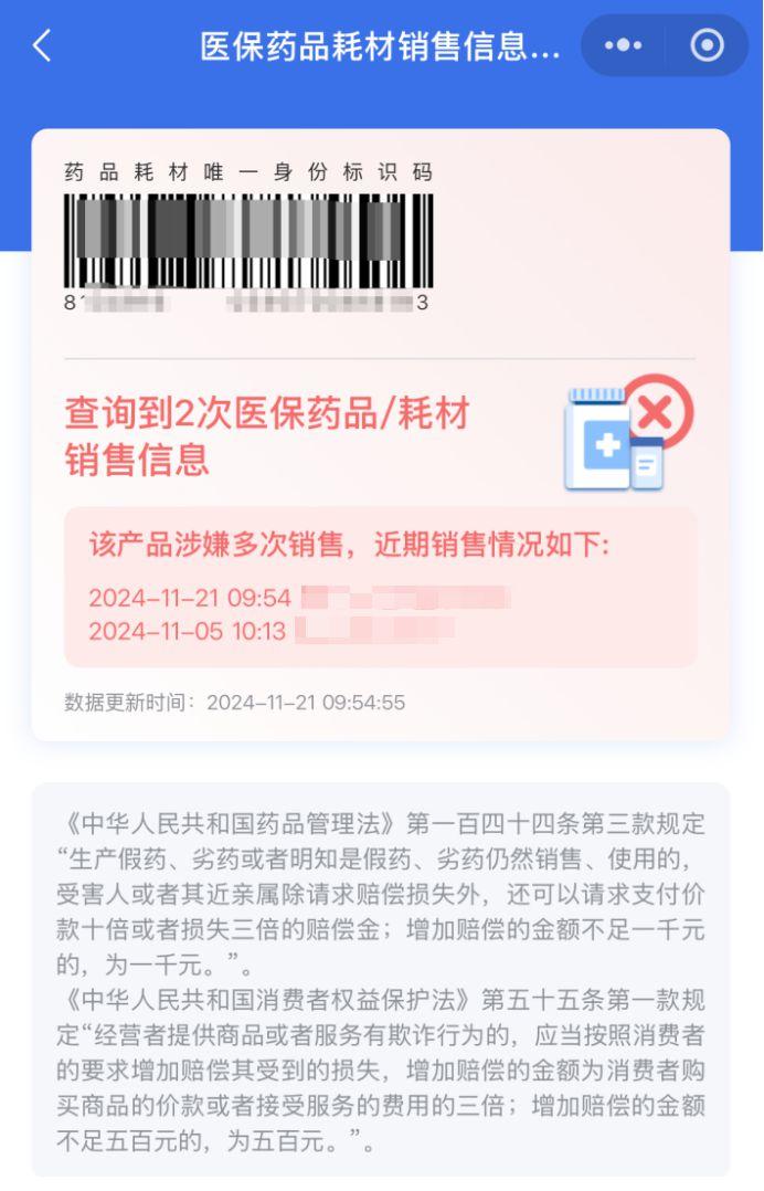 界面如提示“查询到多次医保药品/耗材销售信息”并显示出最近几次的销售记录,该情况说明被查询产品涉嫌多次销售,群众可依据此信息按照《中华人民共和国药品管理法》、《中华人民共和国消费者权益保护法》相关条款要求,向销售此药品的定点医药机构索赔。