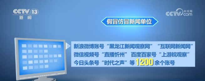 假冒仿冒新闻单位。新浪微博账号“黑龙江新闻观察网”“互联网新闻网”、微信视频号“直播忻州”、百度百家号“上游皖观察”、今日头条号“时代之声”等1200余个账号,在名称、头像、简介等账号信息中使用与新闻单位相同或相似内容,违规发布新闻信息。相关账号已被依法依约关闭或禁言。
