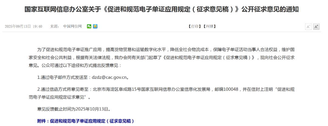 为了促进和规范电子单证推广应用,提高货物贸易和运输数字化水平,降低全社会物流成本,保障电子单证活动当事人合法权益,维护国家安全和社会公共利益,根据有关法律法规,国家互联网信息办公室会同有关部门起草了《促进和规范电子单证应用规定(征求意见稿)》,现向社会公开征求意见。