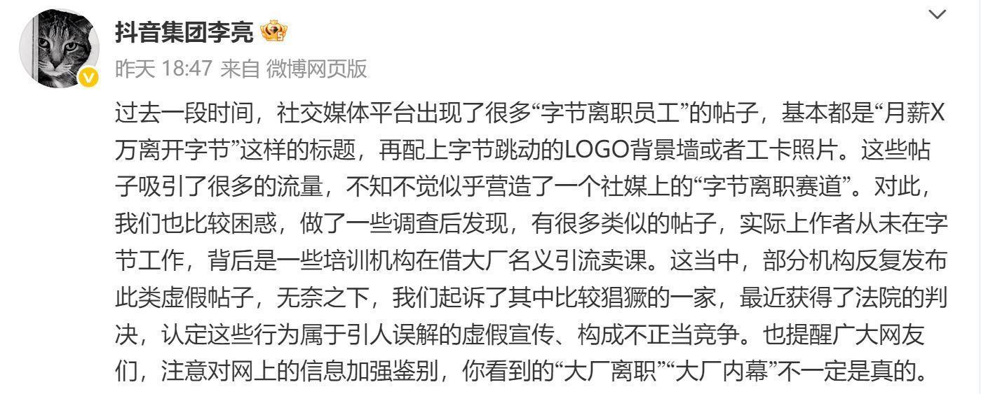 9月15日,湖南长沙开福区法院公布抖音起诉虚假离职员工案件判决,被告长沙某教育科技有限公司指使员工假冒字节跳动离职员工,在小红书发布虚假笔记引流卖课,构成不正当竞争,被判赔偿5万元。同日,抖音副总裁李亮指出,社交媒体上大量虚假“字节离职员工”帖子形成灰色产业链,提醒网友加强鉴别,并呼吁平台持续治理。