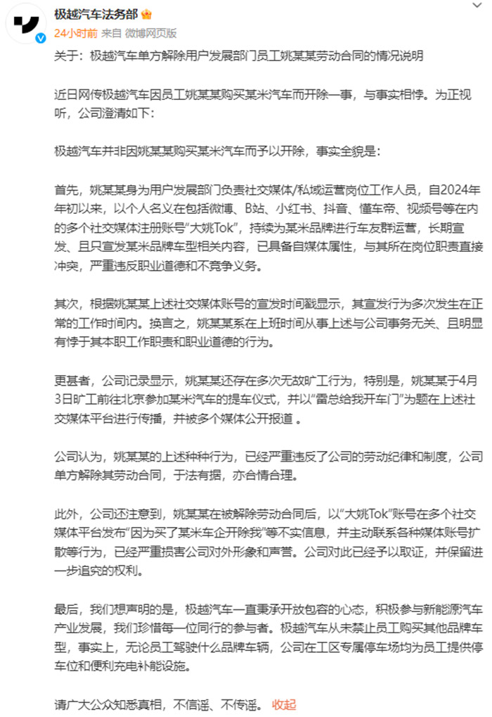 对此,极越方面在回应中表示,姚某某身为用户发展部门负责社交媒体/私域运营岗位工作人员,持续为某米品牌进行车友群运营,长期宣发、且只宣发某米品牌车型相关内容,与其所在岗位职责直接冲突,严重违反职业道德和不竞争义务。