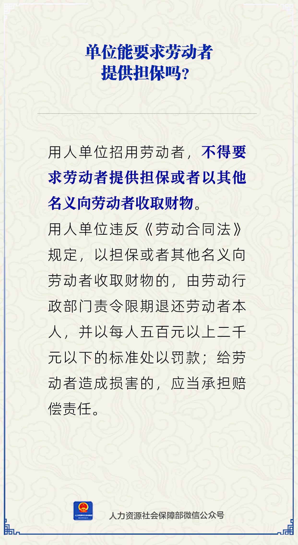 中新网2月27日电 单位能要求劳动者提供担保吗?就这一问题,人力资源和社会保障部27日在微信公众号进行了解读:用人单位招用劳动者,不得要求劳动者提供担保或者以其他名义向劳动者收取财物。
