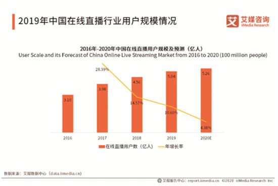 近年来,电商行业的快速崛起,对传统店面销售有着巨大的影响和冲击。据艾媒咨询数据显示,2019年中国在线直播行业用户规模达5.04亿人,增长率为10.6%,2020年用户规模预计达5.26亿人。