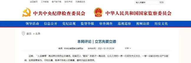 12月19日晚,中央纪委国家监委网站发布《本网评论 | 立艺先要立德》。