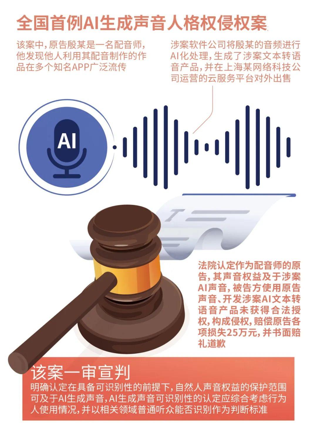 2024年4月,北京互联网法院一审开庭宣判了全国首例AI生成声音人格权侵权案,明确认定在具备可识别性的前提下,自然人声音权益的保护范围可及于AI生成声音。同时,AI生成声音可识别性的认定应综合考虑行为人使用情况,并以相关领域普通听众能否识别作为判断标准。