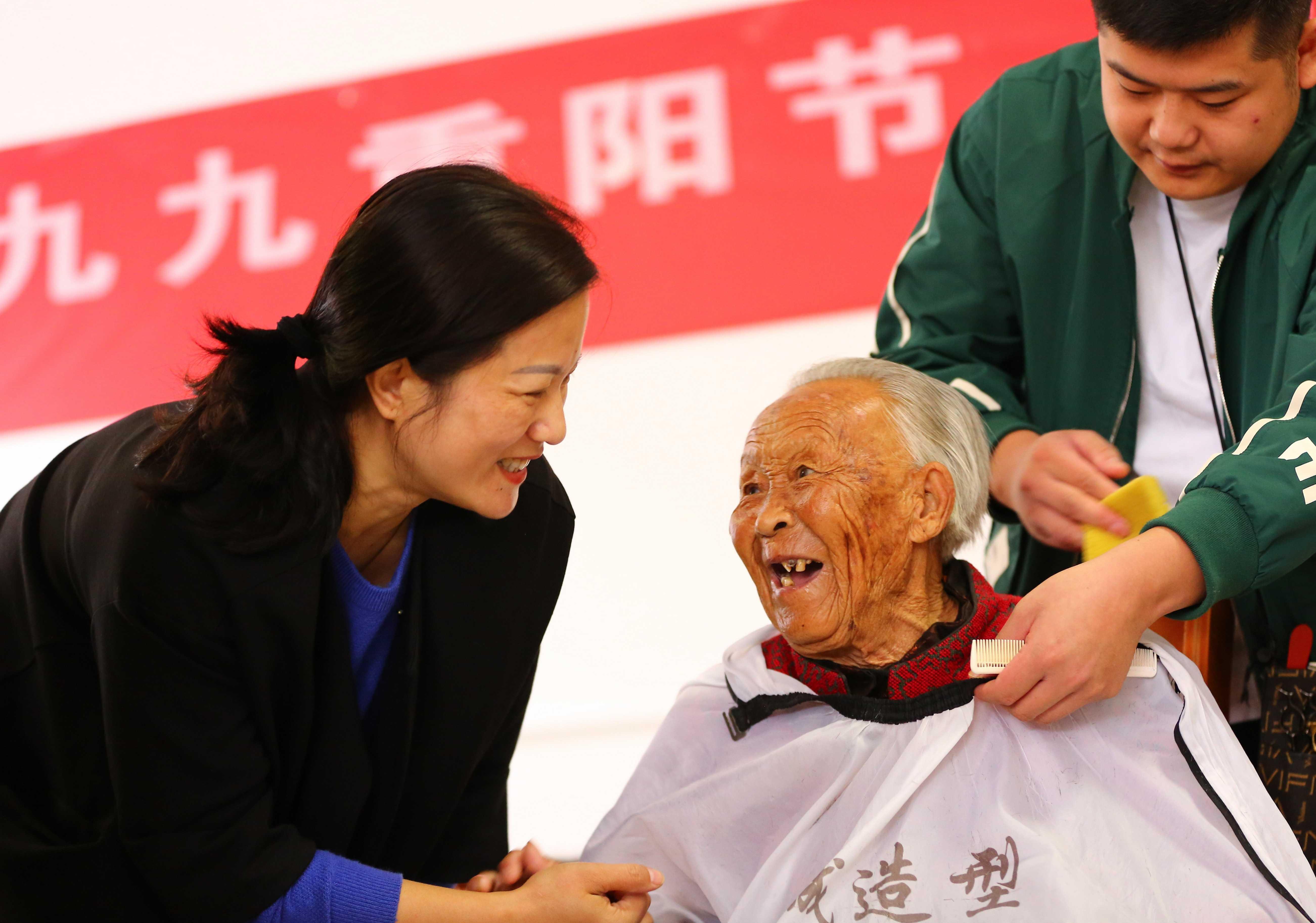 社会工作者为老人理发 李志军 摄