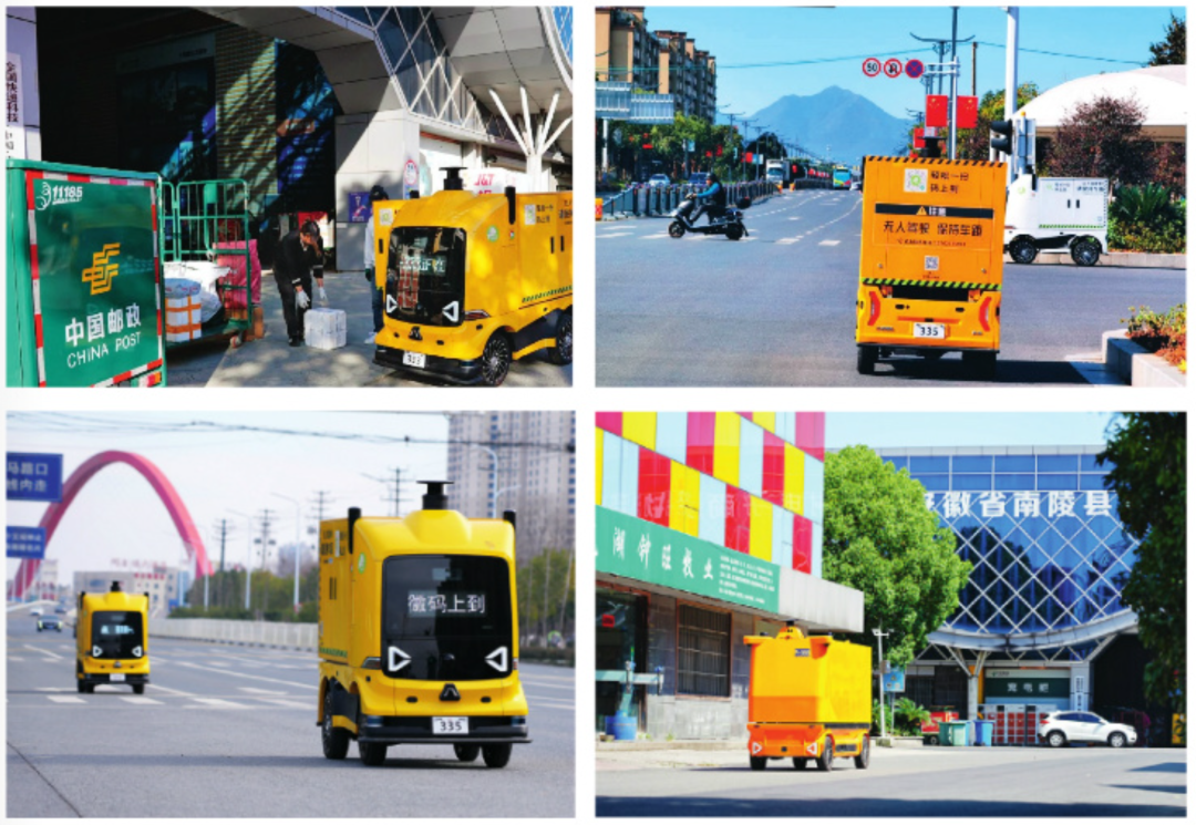 ▲在安徽省南陵县道路上行驶的无人快递车,实现从快递终点站到小区快递驿站“最后一公里”的快递转运。受访者供图