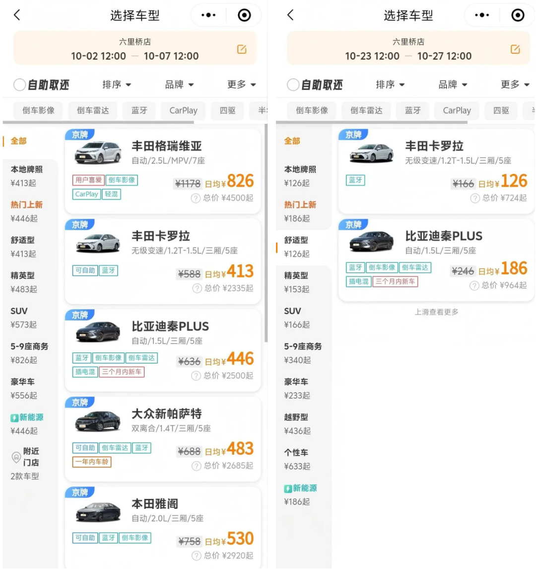 ▲某租车平台国庆期间和节后租车价格对比。
