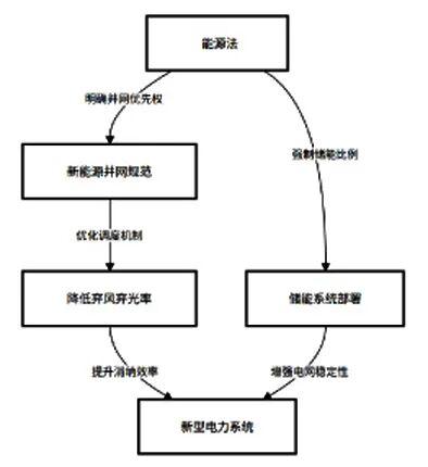 值得关注的是储能系统规模化应用趋势的形成,能源法中强制性条款的推动作用不可忽视。2023年《电力法实施细则》修订版中明确规定:新建风电及光伏项目须配置不低于15%容量的储能设施。电网应对新能源间歇特性的能力由此获得显著增强。如图1所示,从能源法颁布实施到新型电力系统构建的关键路径得以完整呈现。优先并网权的确立与强制储能比例的设定通过该图清晰展现,调度机制的优化与储能设施的大规模建设共同作用的结果是:弃风弃光现象的减少化以及电网对可再生能源接纳度的提升化,最终实现整个系统稳定性能的强化。