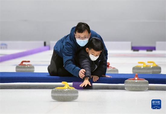 2023年1月23日,游客在“冰立方”冰上运动中心体验冰壶运动。新华社记者 任超 摄