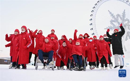2023年2月9日,黑龙江省残疾人后备运动员集训队在第七届中国残疾人冰雪运动季北方主场活动现场合影。新华社记者 李贺 摄