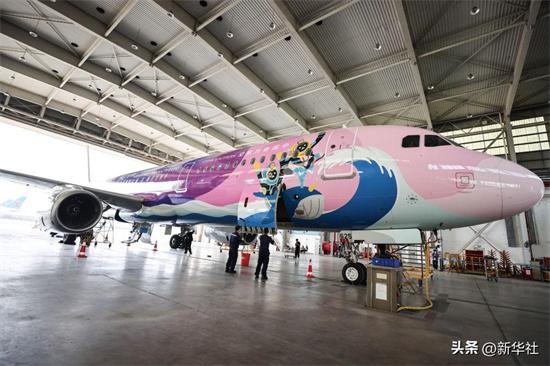 2023年3月7日,在海口美兰国际机场,南航机务人员对“消博号”彩绘飞机进行深度检查。新华社记者 张丽芸 摄