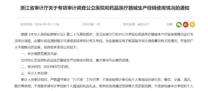 浙江省审计厅关于专项审计调查公立医院和药品医疗器械生产经销使用情况的通知。图片来源:浙江省审计厅官网