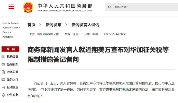 答:中方注意到有关情况。近日,中方已就美威胁对华加征100%关税等限制措施阐明了有关立场。我愿重申,关于稀土等相关物项的出口管制措施,是中国政府依据法律法规,完善自身出口管制体系的正当做法。中国作为负责任大国,始终坚定维护自身国家安全和国际共同安全,中国的出口管制不是禁止出口,对符合规定的申请将一如既往地予以许可,共同维护全球产供链安全稳定。措施出台前,中方已通过双边出口管制对话机制向美方进行了通报。反观美方,长期泛化国家安全,滥用出口管制,对华采取歧视性做法。特别是中美马德里经贸会谈以来美方持续新增出台一系列对华限制措施,严重损害中方利益,严重破坏双方经贸会谈氛围,中方对此坚决反对。