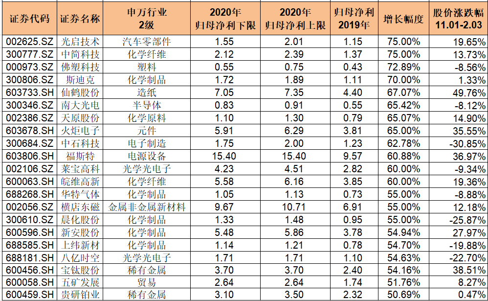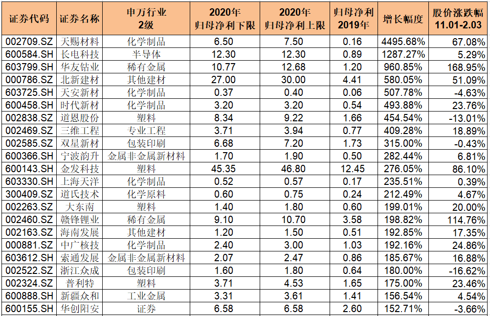 此外,在65家净利润预增的新材料概念上市公司中,有34家增长幅度在100%以上,其中,天赐材料(002709.SZ)、长电科技(600584.SH)、华友钴业(603799.SH)、北新建材(000786.SZ)和天安新材(603725.SH)位居前五位,其业绩均为预增,分别同比增长4495.68%、1287.27%、960.85%、580.05%和507.78%(按预告净利润的上限计算)。