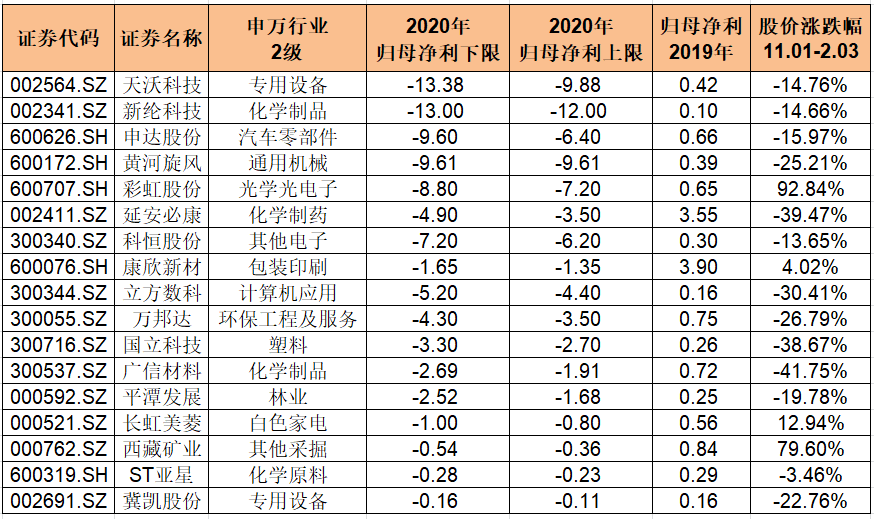 其中,由盈利转为亏损幅度最大的为天沃科技(002564.SZ)、新纶科技(002341.SZ)、申达股份(600626.SH)、黄河旋风(600172.SH)、彩虹股份(600707.SH),其“业绩变脸”幅度(注:2019年盈利减去2020年预计最大亏损)分别达13.8亿元、13.10亿元、10.26亿元、10.00亿元和9.45亿元。
