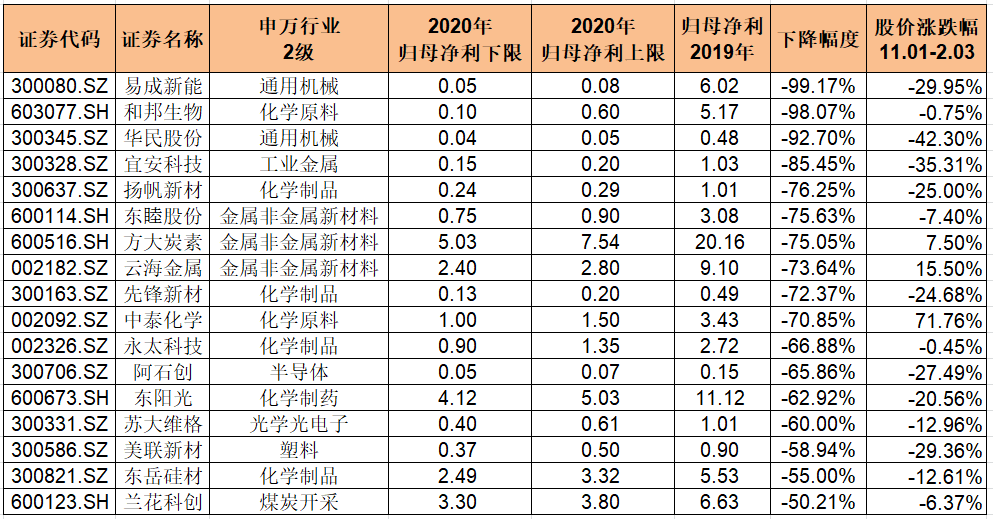 而在18家净利润预减的新材料概念上市公司中,其中易成新能(300080.SZ)、和邦生物(603077.SH)、华民股份(300345.SZ)、宜安科技(300328.SZ)和扬帆新材(300637.SZ)位居降幅前五位,分别同比下降99.17%、98.07%、92.70%、85.45%和76.25%(按预告净利润的下限)。