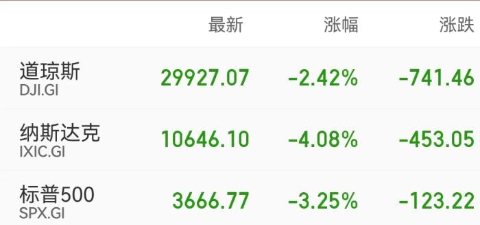中新财经6月17日电 当地时间6月16日,美股再度暴跌。截至收盘,道指下跌741.46点,跌幅2.42%报29927.07点,自2021年1月以来首次跌破3万点;纳斯达克综合指数下跌453.05点,跌幅4.08%报10646.10点;标准普尔500指数下跌123.22点,跌幅3.25%报3666.77点。