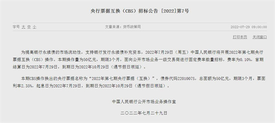 中新网7月29日电 央行网站7月29日消息,为提高银行永续债的市场流动性,支持银行发行永续债补充资本,2022年7月29日(周五)中国人民银行将开展2022年第七期央行票据互换(CBS)操作。本期操作量为50亿元,期限3个月,面向公开市场业务一级交易商进行固定费率数量招标,费率为0.10%,首期结算日为2022年7月29日,到期日为2022年10月29日(遇节假日顺延)。
