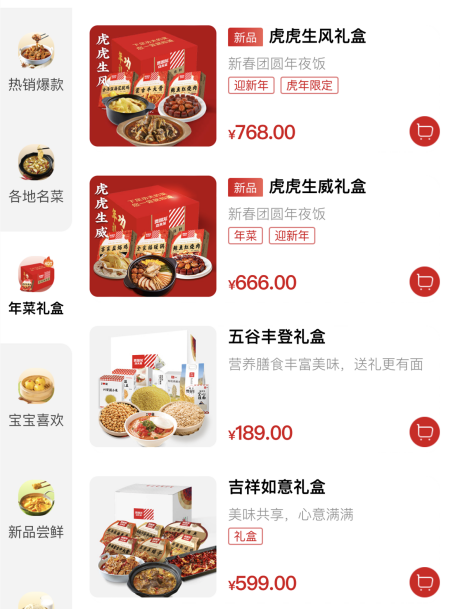 记者进入商城发现,西贝莜面村推出的“预制菜年夜饭”礼盒种类繁多,包含蒙古牛大骨、全家福暖锅、功夫羊杂汤等。除固定礼盒外,还推出“金汤深海花胶鸡”“鲍鱼红烧肉”等单品菜,价格均为299元。