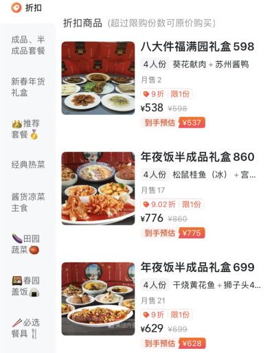 记者发现,在美团APP上,同春园提供了四种半成品年夜饭外卖套餐方便用户订购,价格从200元到800元不等。平台打折后,价格最低套餐为286元,包含八宝饭、熏鱼、苏州酱鸭、豆包等8个菜品。价格最高的套餐为776元,包含松鼠桂鱼、宫保虾球、香酥鸭子等6个菜品。
