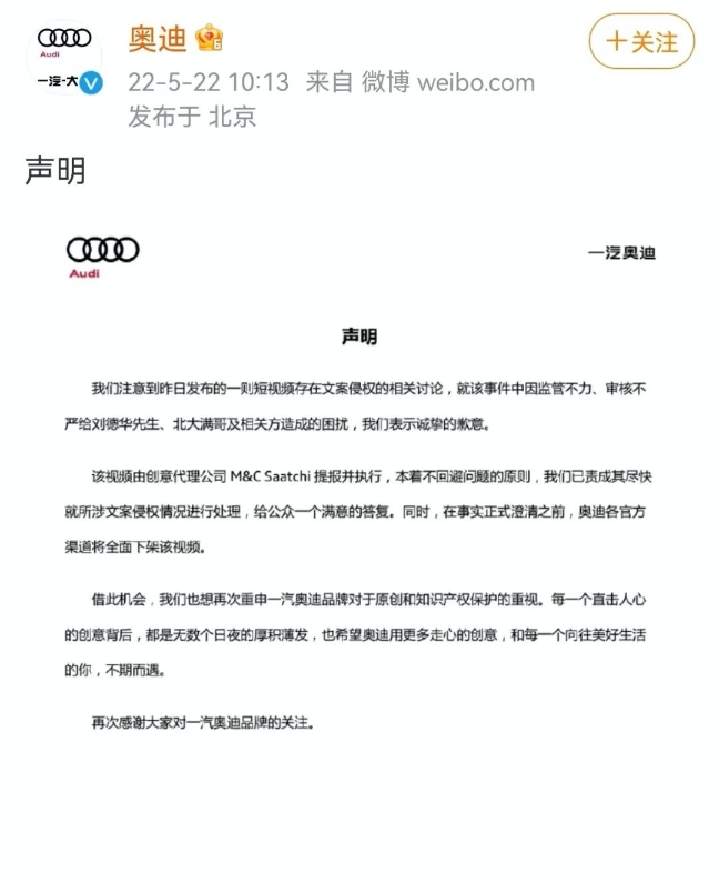 5月22日上午,奥迪承认文案涉侵权,并发布致歉声明称,已对该情况进行处理,会给公众满意答复,同时全面下架相关视频。同日午间,奥迪小满篇品牌视频开发团队所属公司,上思广告发布声明,向刘德华、“北大满哥”及奥迪致歉,并承诺尽最大努力弥补对原作者的损失。