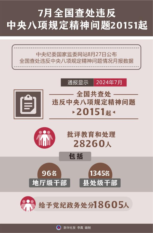 新华社北京8月27日电(记者孙少龙)中央纪委国家监委网站27日公布全国查处违反中央八项规定精神问题情况月报数据。通报显示,今年7月,全国共查处违反中央八项规定精神问题20151起,批评教育和处理28260人(包括96名地厅级干部、1345名县处级干部),给予党纪政务处分18605人。