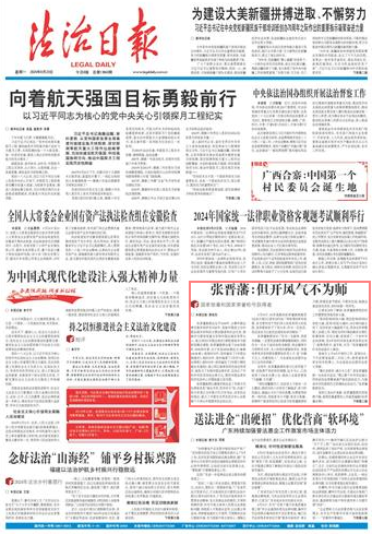 9月16日,94岁高龄的张晋藩教授接受《法治日报》记者采访时说:“我取得的所有成绩,首先要归功于我们伟大的党和伟大的祖国。党和国家给予了我太多。作为一名党员,我应该全力以赴把法制史的学问做好。”