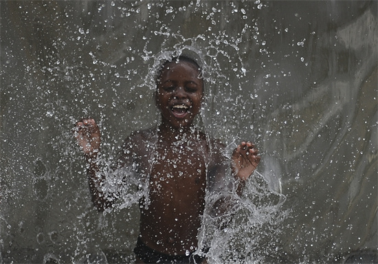 当地时间3月2日,巴西里约热内卢遭遇高温,孩童在水中解暑。