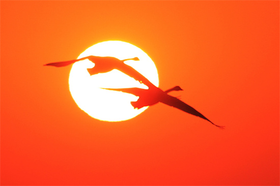 天气转暖,山东荣成大天鹅国家级自然保护区的天鹅即将开启迁徙之旅。图为2月24日清晨,两只天鹅映着朝阳飞翔。