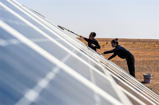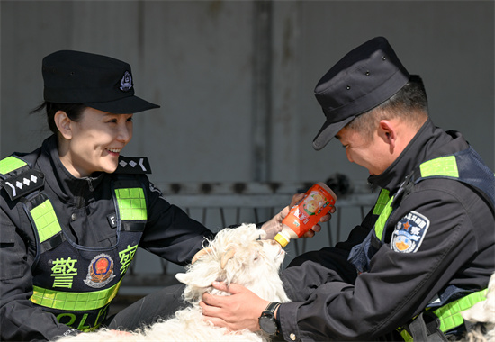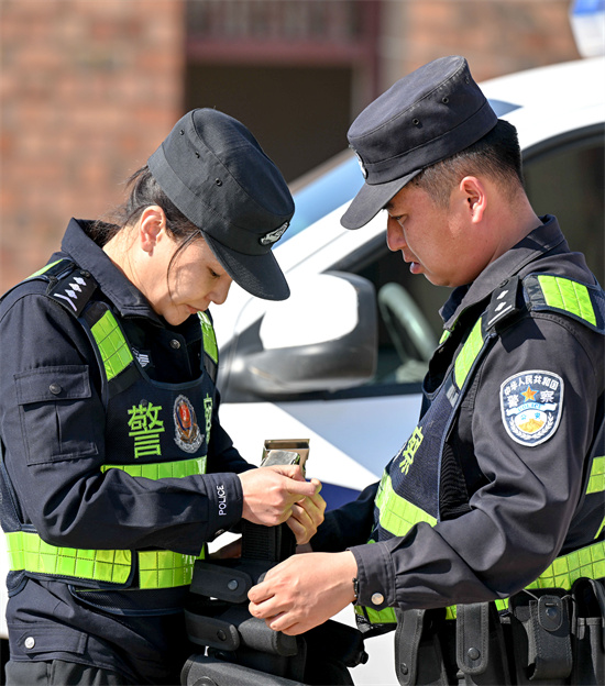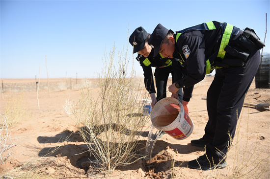 在内蒙古阿拉善盟阿拉善左旗与蒙古国接壤的边境线上,一对90后夫妻,“几间砖房支口锅,两人一狗一台车”,组成“夫妻警务室”,扎根大漠深处,共同守卫边境线。两人不仅担负起边境区域的巡逻防控任务,也承担着为困难群众提供帮助的使命。图为4月18日,丈夫徐乃超和妻子李文娜在巡逻(无人机照片)。