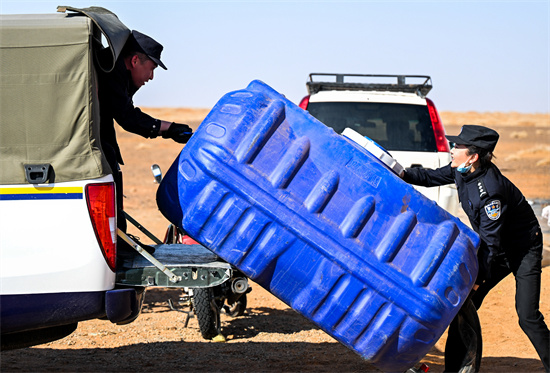 饮用水和生活用水都要到10多公里外去拉,徐乃超(左)和李文娜往车上装水桶。