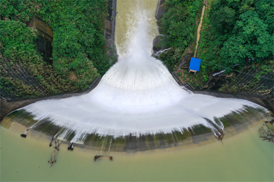 汛期到来,广西桂林市全州县源口水库溢洪瀑布景观。