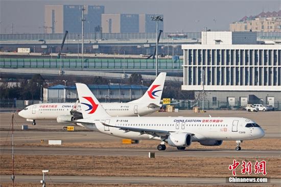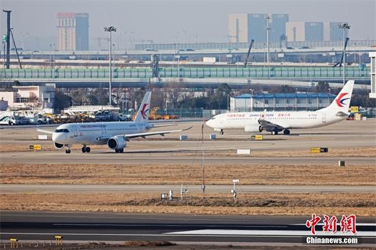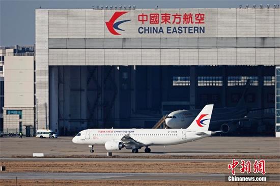 1月28日,东航全球首架C919国产客机在虹桥机场进入跑道,开始兔年的首次飞行。当日,中国东航全球首架C919国产客机执行MU7817/8和MU7819/20两个虹桥南昌往返航班。据悉,中国东航有望在2023年春正式开启C919商业载客运营。 中新社记者 殷立勤 摄