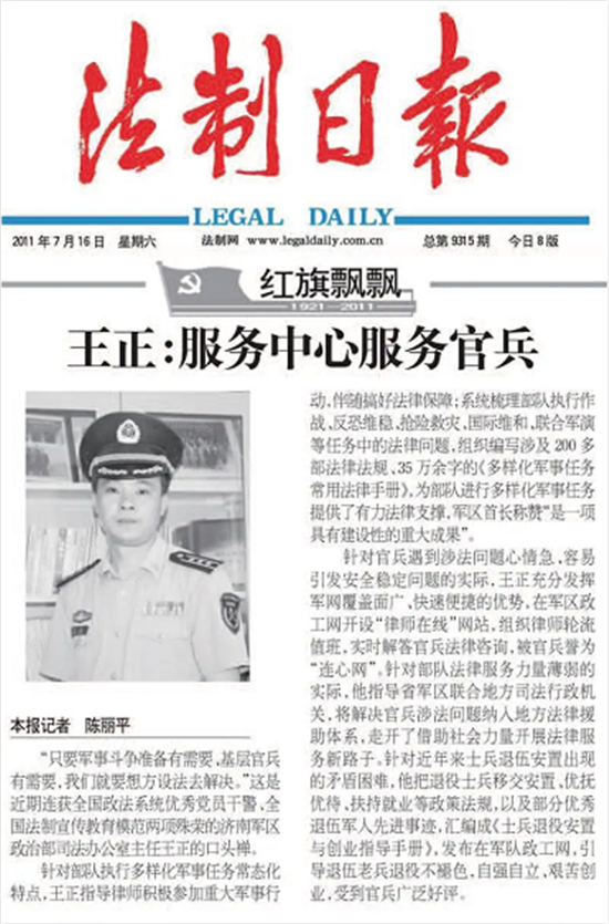 最初我只是《法制日报》的一名忠实读者,没想到后来成为她宣传的对象。记得是2011年7月,恰逢建党90周年,各大媒体相关宣传如火如荼。当时,我先后被中宣部、司法部表彰为全国法制宣传教育模范,被中央政法委表彰为全国政法系统优秀党员干警,首次走入人民大会堂接受颁奖。当我还处在颁奖的兴奋中时,突然接到军区政治部新闻干事的电话,说是《法制日报》要从1000名受表彰的个人中选取20人重点宣传,报社记者陈丽平要采访我。不久,《王正:服务中心服务官兵》一文在《法制日报》庆祝建党90周年“红旗飘飘”栏目登出。有幸成为20位代表之一,无形中放大了我的工作成果和影响,确实倍感鼓舞和激励,为我后来成长为济南军区“爱岗敬业”机关干部典型写下注脚。