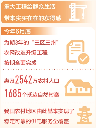 从“用上电”到“用好电”,今年6月底,为期3年的“三区三州”农网改造升级工程按期全面完成,惠及2542万农村人口、1685个抵边自然村寨,我国农村地区由此基本实现了稳定可靠的供电服务全覆盖。