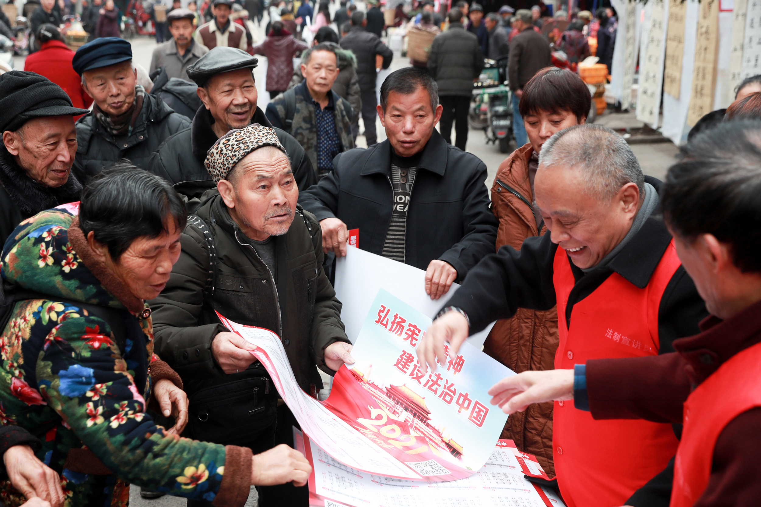 12月1日,四川省华蓥市高兴镇赶场的群众在领取法治宣传志愿者发放的法治年画。第七个国家宪法日来临之际,四川省华蓥市市委依法治市办公室和市老年法治宣讲团、关心下一代工作委员会,联合组织法治宣传志愿者,利用群众较集中的赶场日巡回到各乡镇,通过法治书法作品展、为群众义务书写法治对联、赠送法治年画和宣讲“民法典”等法律法规及法治咨询等形式,宣传法治知识,让在寒冬中的山区群众感受法治文化带来的温暖。