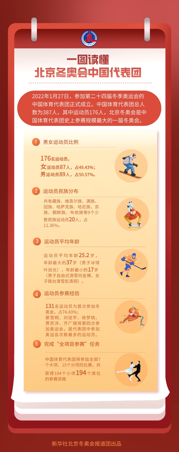 北京冬奥会中国体育代表团总人数为387人,其中运动员176人,教练员、领队、科医人员等运动队工作人员164人,团部工作人员47人。北京冬奥会是中国体育代表团历史上参赛规模最大的一届冬奥会。