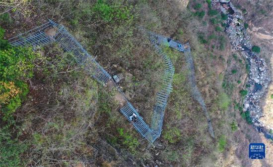 在四川省凉山彝族自治州昭觉县“悬崖村”阿土列尔村,村民沿着钢梯下山(2020年5月13日摄,无人机照片)。新华社记者 王曦 摄