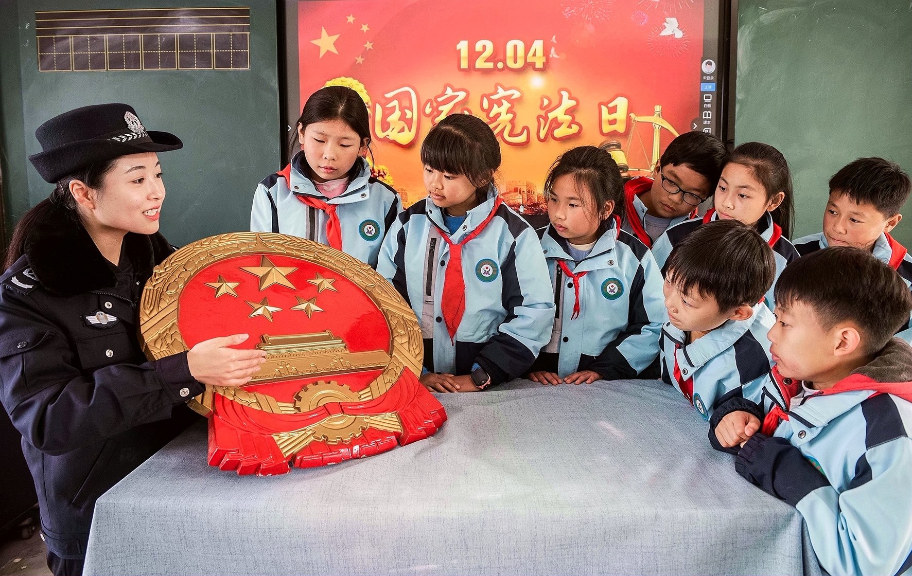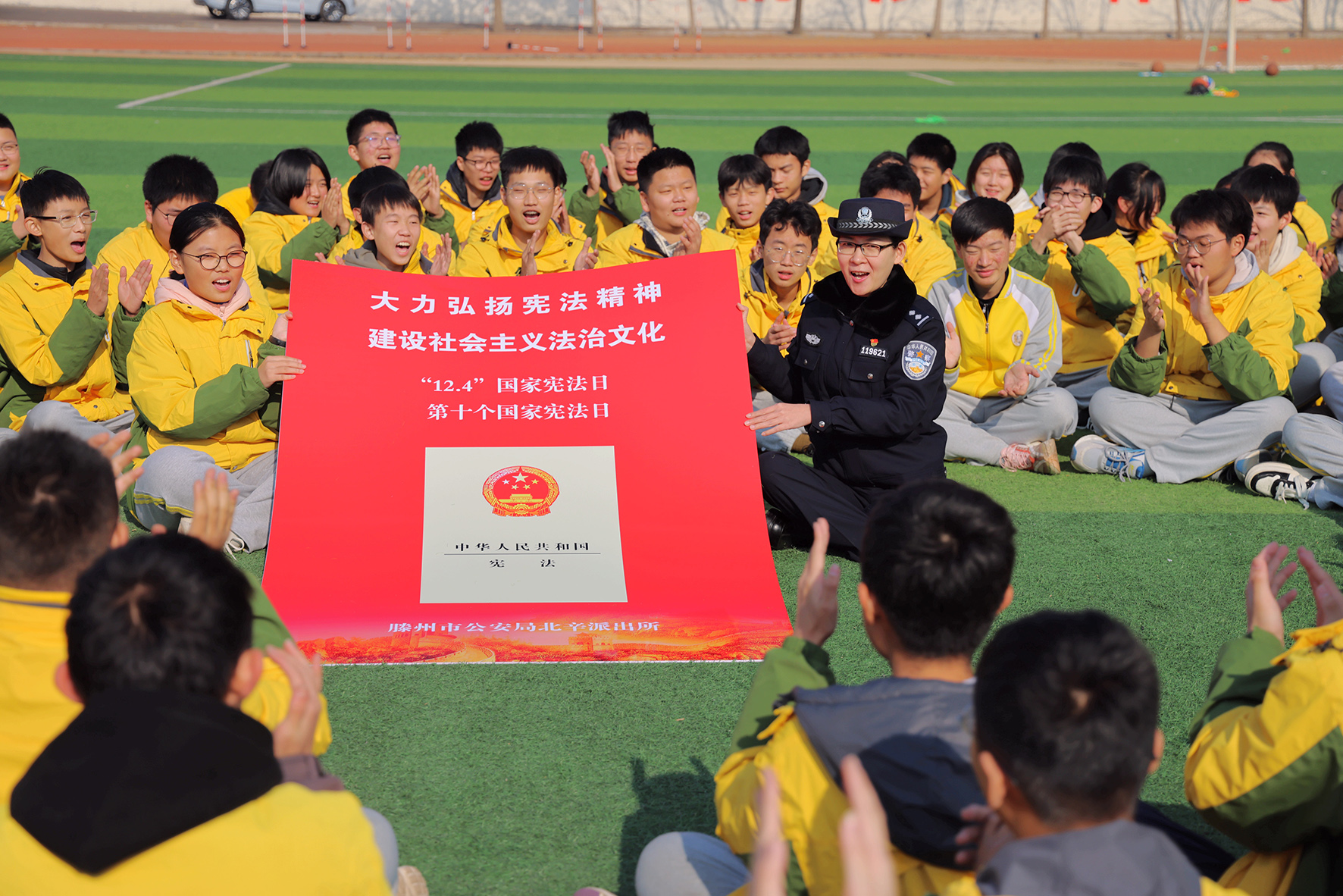 12月4日,山东省滕州市公安局北辛派出所民警为学生们讲解宪法知识。